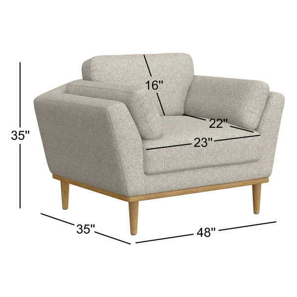 Sinking into the soft cozy chenille fabric of this chair that just might have you thinking you've gone to paradise. Wide angled arms support plush pillows for a friendly shape further warmed up with a toasty brown exposed solid wood frame and modern tapered legs. Life could be a dream with this chair.