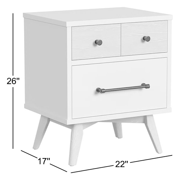 Elevate your nursery with the Ren 2-drawer modern wood nightstand in ash linen white. A part of the Ren collection, this nightstand seamlessly combines modern design with functionality. Its distinctive two-toned finish, ash linen, adds a contemporary flair to your baby's room. Crafted with care, this nightstand is not only visually appealing but also practical, providing ample storage space. With its overall product dimensions measuring, this nightstand is designed to meet the demands of modern paRenting while enhancing the nursery's aesthetic.