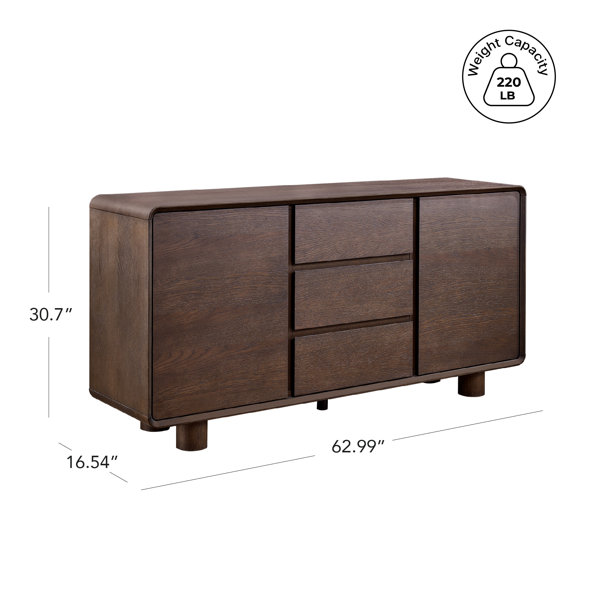This sideboard showcases refined modern simplicity through its sleek, elongated silhouette and clean, integrated design. Crafted from MDF with natural wood veneer and eco-friendly finishes, it highlights fine craftsmanship and a high-end aesthetic. The cabinet combines open shelving, drawers, and door storage for versatile organization, all within a handle-free, seamless façade. Rounded legs lift the structure for a lighter, more elegant presence, reducing visual weight while maintaining stability. A back panel opening adds practical cable management, blending form and function effortlessly for contemporary living spaces.