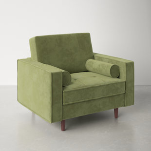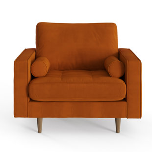 Retro for real life. This mid-century modern-inspired armchair showcases track arms, tapered dowel legs, and a button tufted seat cushion. It’s built with a solid wood frame and wrapped in richly colored velvet upholstery. Welted seams + cylindrical throw pillows add tailored finishing touches.