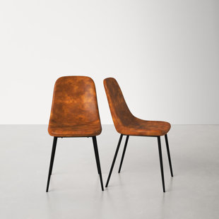 Simple designs + Industrial mixed materials. This pair of versatile side chairs outfits your space with a nod to retro designs. Crafted from metal, the base features four slim legs that taper at the foot, forming a simple modern silhouette. The seat and back have a bucket design, and are upholstered in vegan leather with foam filling for support while you relax. Baseball stitch and welting detail along the seams of the seat give this chair a tactile element. Partial assembly required.