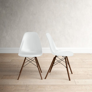 Mid-century style with a textural twist. This pair of streamlined side chairs add a modern design element to your eating area or home office. Crafted from matte-finished molded plastic in a solid color, this chair features a bucket seat with a full backrest and a waterfall edge. The seat is supported by an Eiffel base that features contrasting solid wood legs with a light, natural stain. Architectural stretchers lend added stability, while plastic foot caps save your floors from scuffs and scratches.