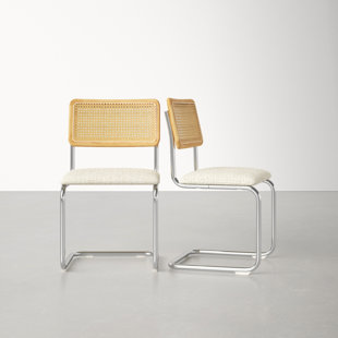Cantilever + cane – it's the chair that works everywhere. Drawing on iconic Bauhaus design, this dining chair features a tubular steel frame with a bright chrome finish. A backrest of solid wood + woven cane adds warm contrast, while plush + padded boucle fabric softens the seat. Set of two.