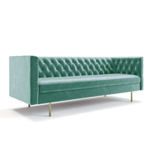 This Chesterfield sofa is updated with slim metal legs + a range of vivid upholstery options. Built from solid eucalyptus wood, it’s wrapped in plush velvet with diamond tufting and welted trim. The reversible seat cushion is supported by sinuous springs; two bolster pillows round out the luxe look.