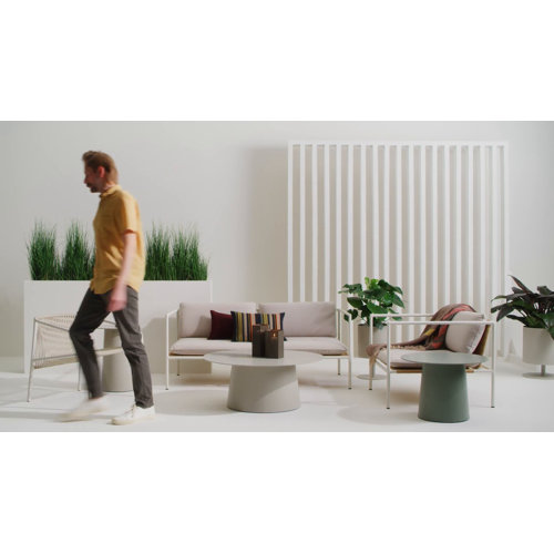 All-weather rattan adds hand-woven texture to an architectural tubular aluminum frame. Designed to have great vistas from all angles. Dog Days is what happens when a minimalist goes on vacation and gets in touch with their inner hippy. The seat and back feature ravioli-style cushions upholstered in high-performance mildew and fade-resistant Sunbrella™ fabric.