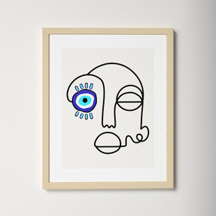 This graphic art print draws on a classic symbol of protection, and layers it into an abstract design for a playful modern look. Printed in the USA, this piece by artist Shatha Al Dafai features a reproduction of the blue "evil eye" design that forms the right eye of a minimalist take on a face. This piece is giclee-printed on paper with an accurate reproduction. It arrives framed and covered with acrylic glass that helps protect the image from fading. Wall mounting hardware is included, so it's ready to hang right out of the box.